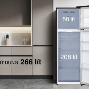 – Dung tích sử dụng 266 lít với 58 lít ngăn đá và 208 lít ngăn lạnh – thích hợp cho gia đình nhỏ hoặc người sống độc thân.